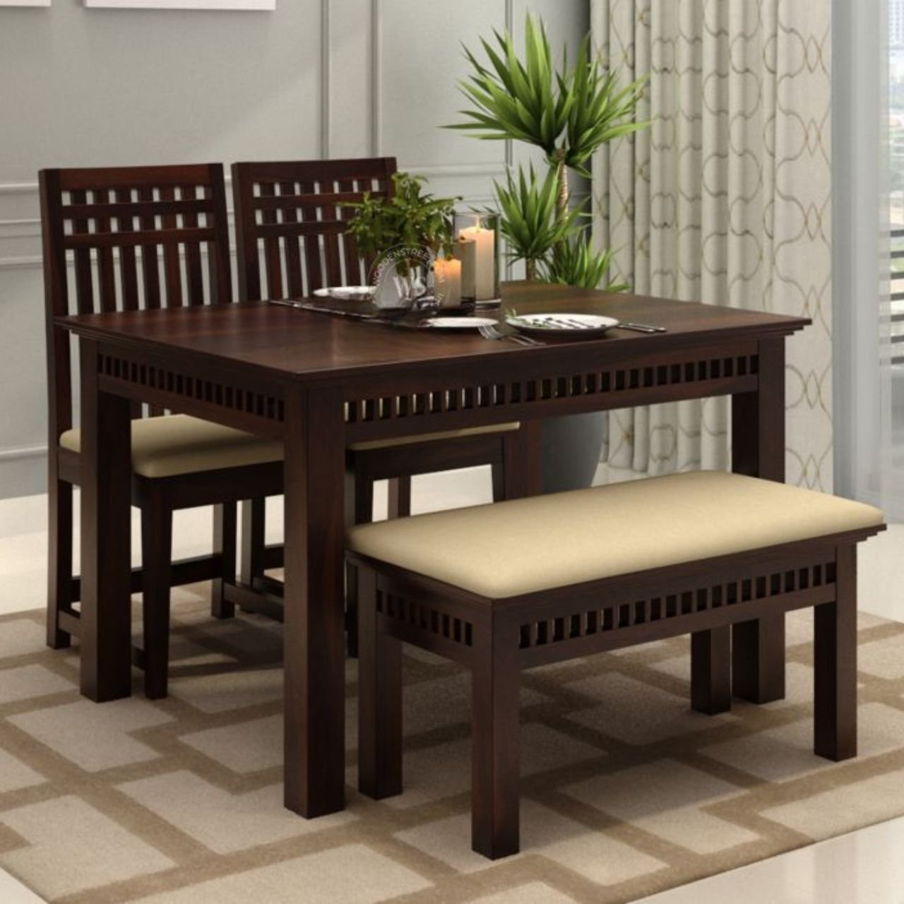 Treven Dining Table Set With Bench – 4 Seater, Walnut Finish
