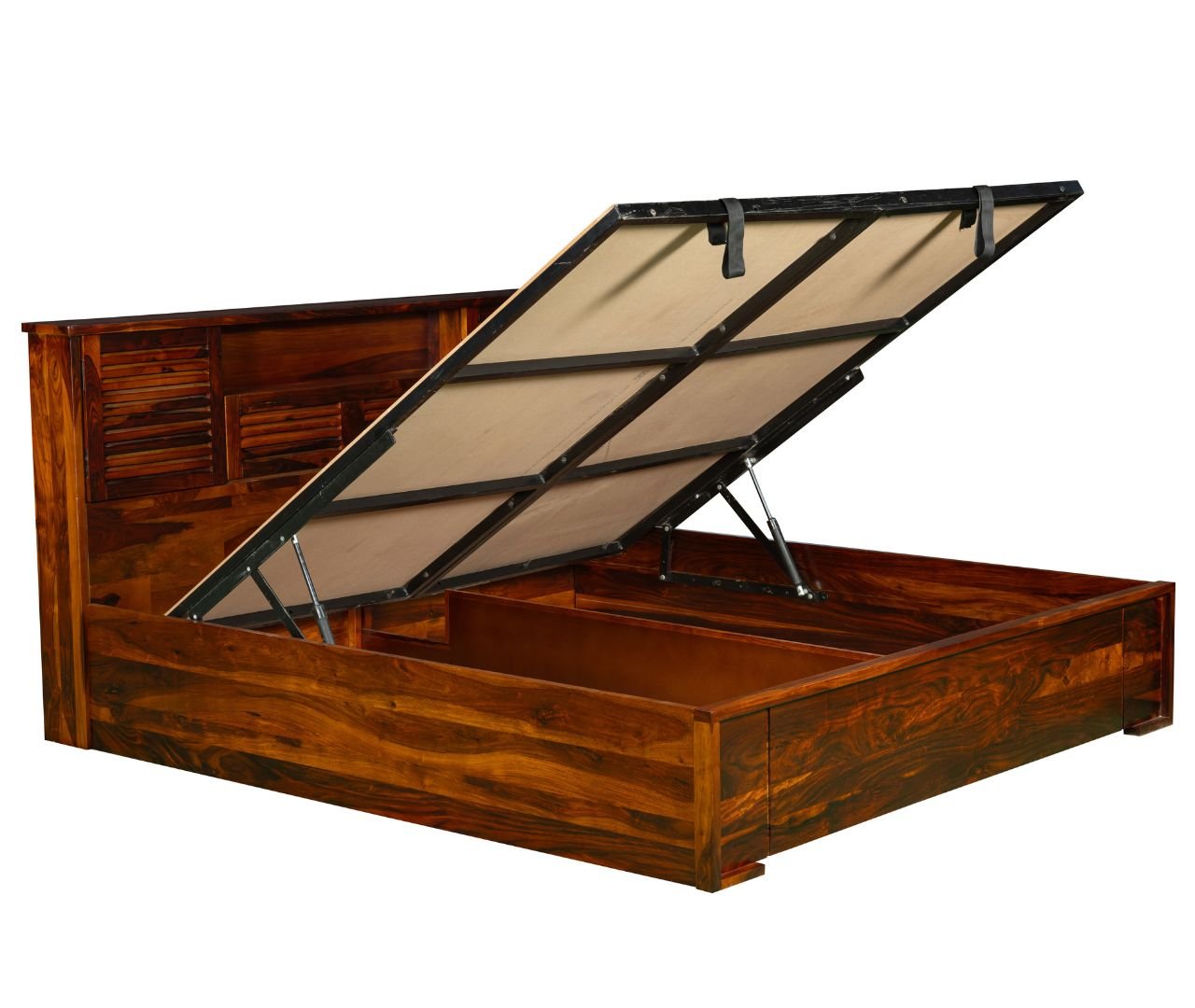 The bed is meticulously crafted from premium-quality Sheesham wood, celebrated for its strength and long-lasting durability. The dense natural grain of the wood lends a rich, timeless appeal, while the premium honey finish enhances its innate beauty — adding depth, warmth, and a touch of classic sophistication to your bedroom.