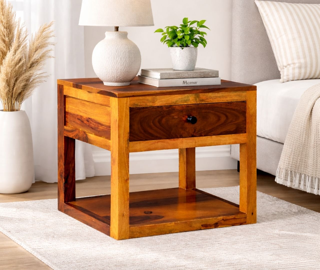 WhisperLeaf Bedside Table – Honey Finish